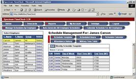 The Spectrum TimeClock Employee Work Time Scheduling feature allows firms to manage employee schedules by using an employee schedule template system that can be applied across multiple time periods. Employees working different hours from day to day can still have their work schedules manually setup by administrators.